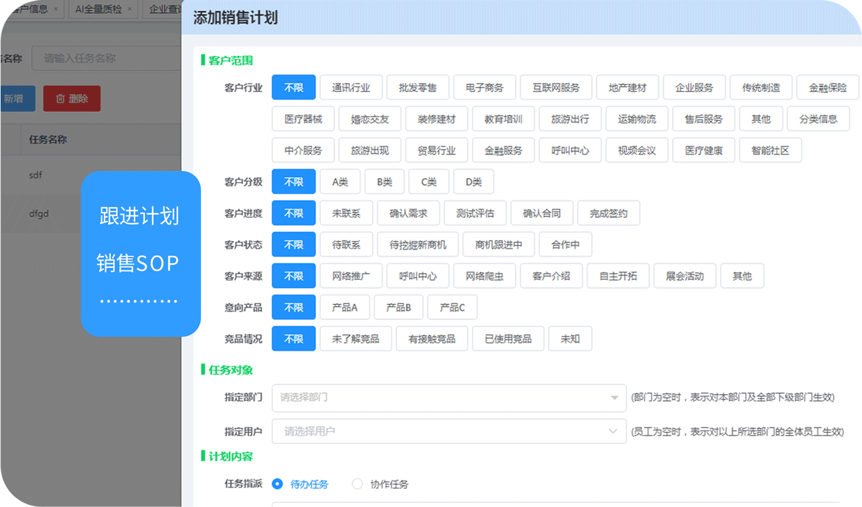 标准化SOP任务流程,在不同的客户进度阶段设置不同的待办任务,并对这些任务进行管理监控,保证每一流程实时跟进。