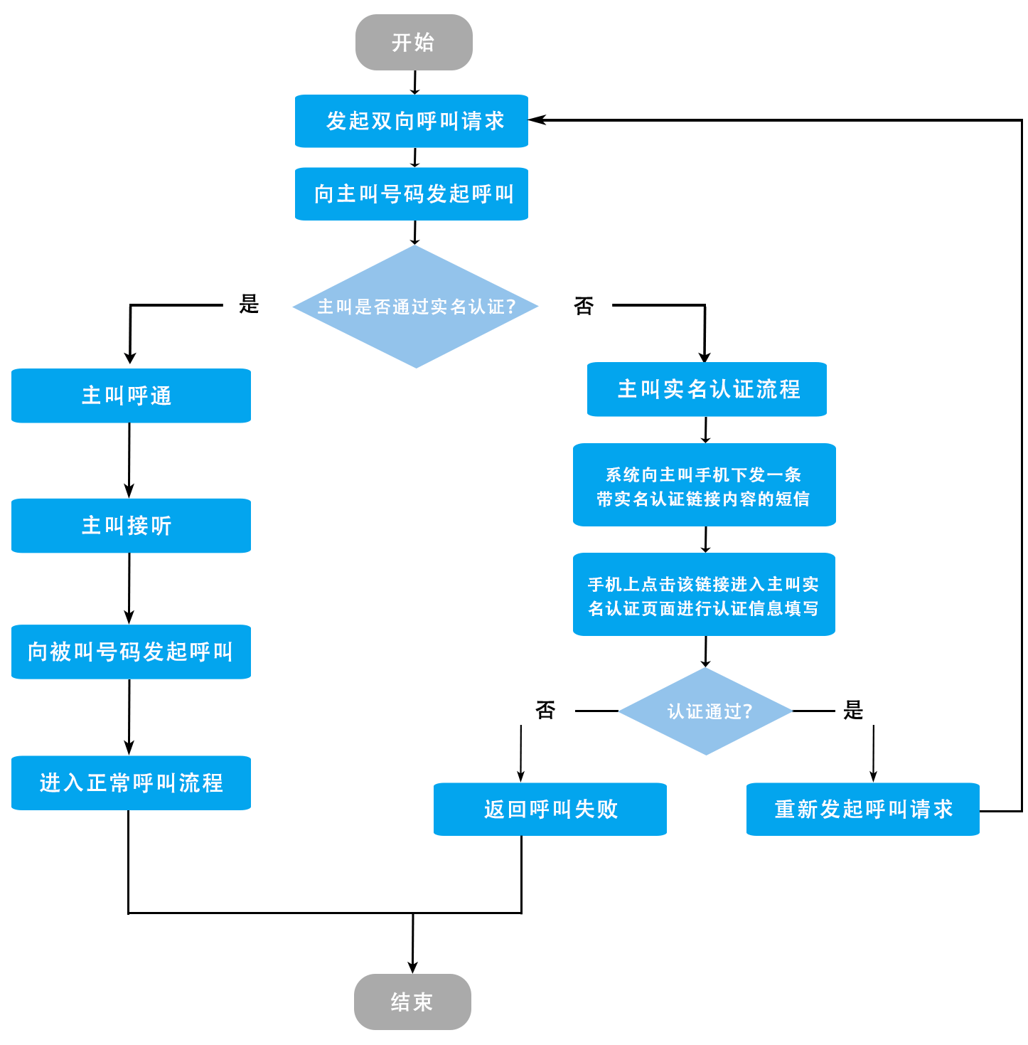 发起双向呼叫的前提是主叫号码进行实名认证。如果主叫未进行过实名认证操作,在发起呼叫请求时,系统会触发一条短信链接到主叫手机上,通过该链接进行姓名、身份证号、手机号三要素以及短信验证码的认证操作。