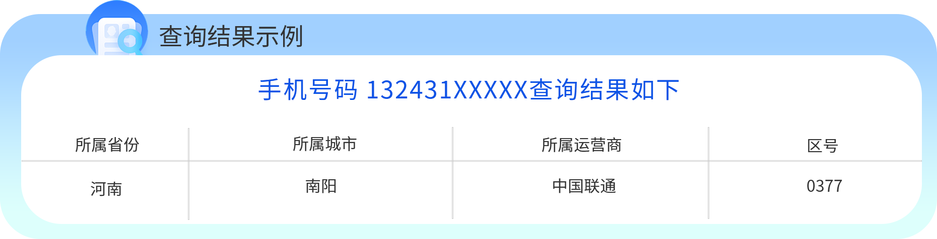 提供全国各省、各市号码段库,实时精准査询号码所属省份、城市、运营商以及区号等信息