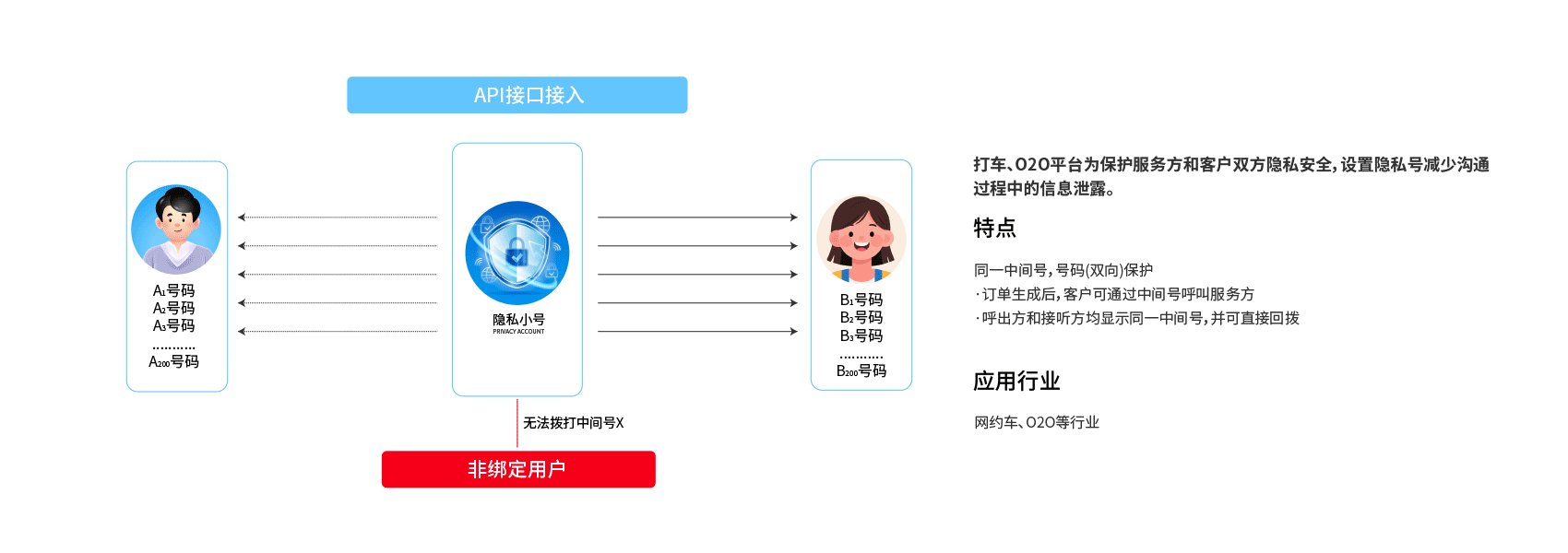 打车出行 在出行场景中,用车订单生成后,司机与乘客之间,建立绑定关系,服务过程双方通过隐私号码联系对方,有效保护隐私,服务结束后,解除绑定,杜绝骚扰行为,双向号码保护,号码复用率高