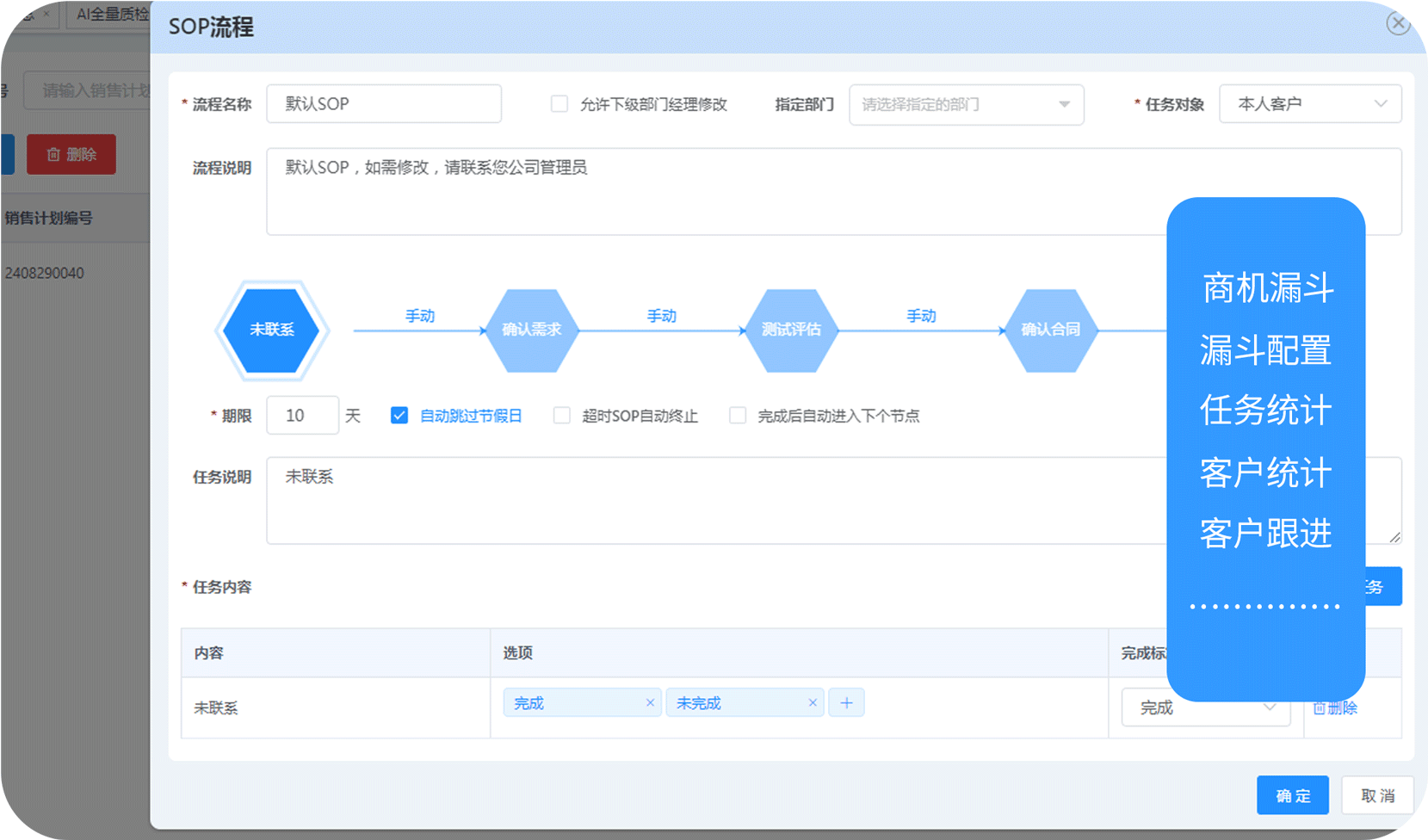 标准化SOP任务流程,在不同的客户进度阶段设置不同的待办任务,并对这些任务进行管理监控,保证每一流程实时跟进。