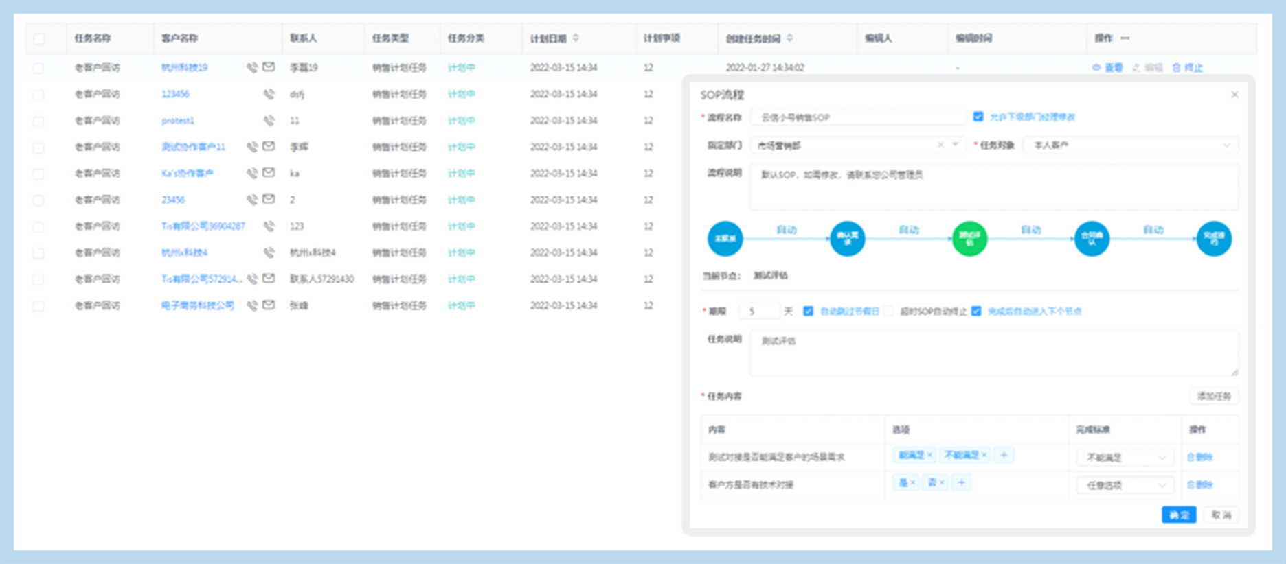 总结销冠经验,规范标准化销售流程,通过任务SOP,针对不同销售进度中的客户,制定相应合理的销售计划。