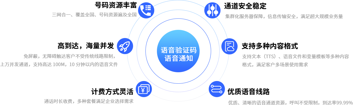 我们提供语音验证码和通知,以及语音线路,确保关键信息准确快速送达,提升到达率和用户体验